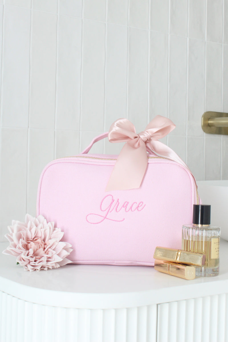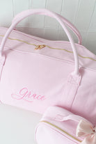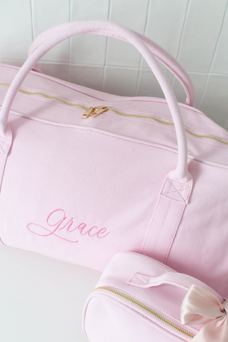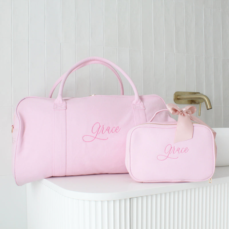 The bag set includes a blush duffle bag and vanity bag, as well as complimentary embroidery personalisation to both bags.