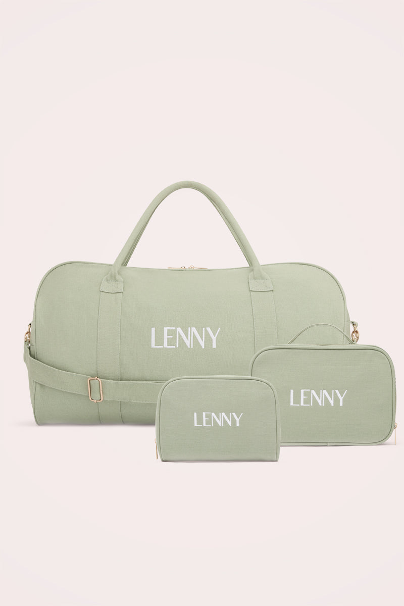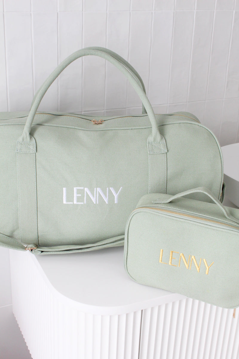 Travel in style with our Personalised Bag Set in sage, designed for those who love a coordinated, elevated look. This matching trio includes a personalised duffle bag, vanity bag and makeup bag — all crafted from premium materials and finished with your chosen name or initials in beautiful embroidery.