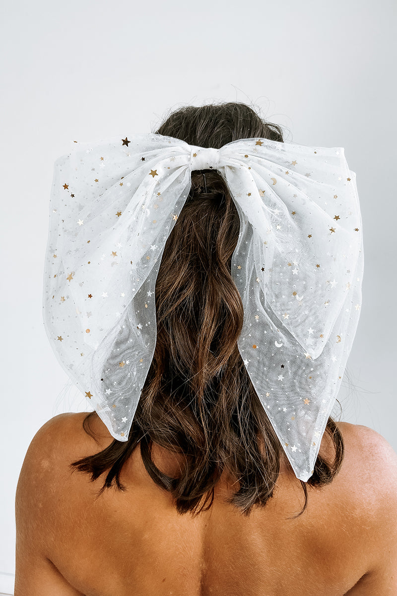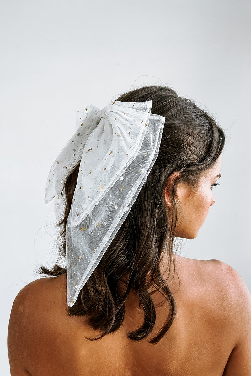 The 'Star & Moon' bow is a chic and fun hair accessory for the bride. The fabric glitters in the light and photographs beautifully, the perfect finishing touch to your outfit. Wear with your hair up or down, this beautiful piece has a metal comb to easily slide in and out of your hair. Dimensions 31cmW x 28cmH. 100% polyester tulle. Do not iron.