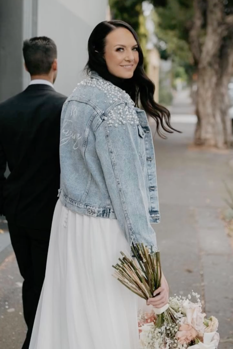 Our personalised pearl denim jacket are the perfect accessory for your wedding day. Featuring pearl and rhinestone encrusted shoulders,Ā and finished with luxe embroidery in the colour of your choice.