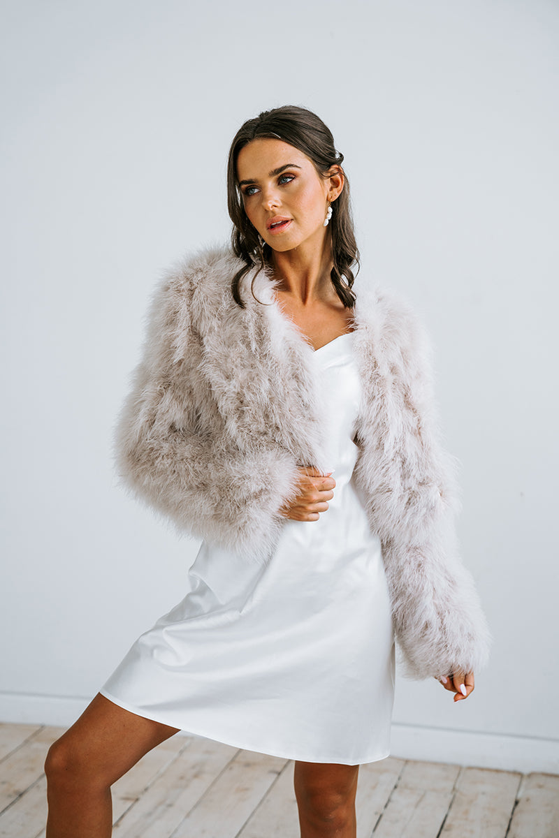 Our Mae Feather jacket features a timeless cropped length and sits elegantly on the shoulders. Crafted from marabou feather, this jacket complements any gown or outfit and can easily be dressed up and down making it a super versatile piece for your wardrobe. Super lightweight & lined in satin this jacket will become a favourite in your wardrobe.