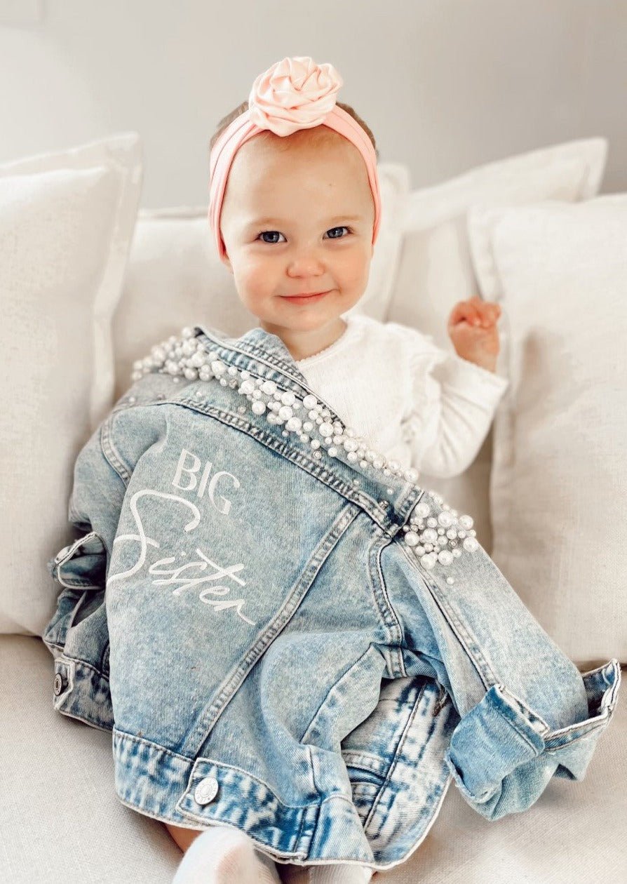 Personalised kids/baby/toddler denim jacket. Our best selling pearl denim jacket now comes in matching kids sizes! Perfect for flower girls, or to match with mum! Our kids denim jackets can be customised with a name, initial or text of your choice (ie 'flower girl'). The jackets are personalised with embroidery, and make a great unique and memorable gift that can be kept as a keepsake.