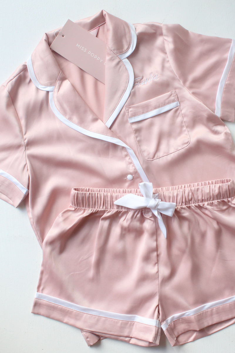 The personalised pyjama set is cut from a super soft matte satin fabric and features contrast piping detailing, fabric covered buttons, ribbon waist tie & a pocket on the chest.