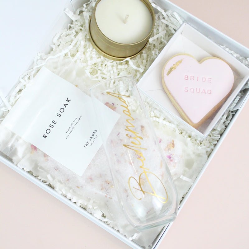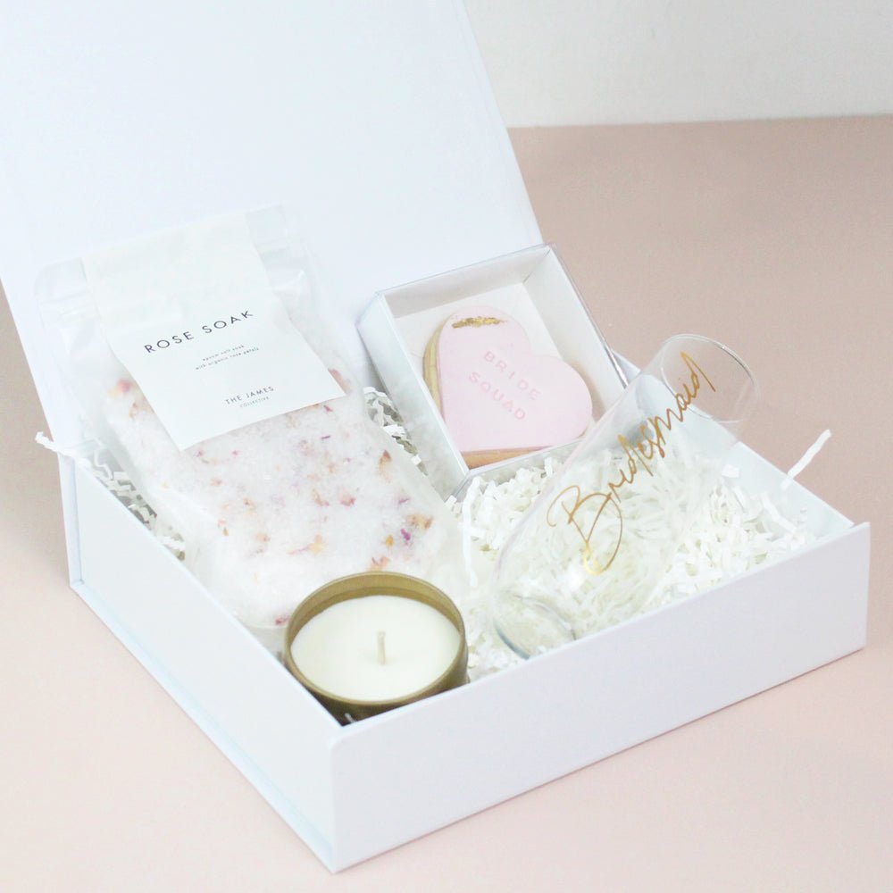 Ask your bridal party 'Will you be my Bridesmaid?' with this blushing bridesmaid box. This gift box is great for not only the bridesmaid, but also the maid of honour and entire bridal party.