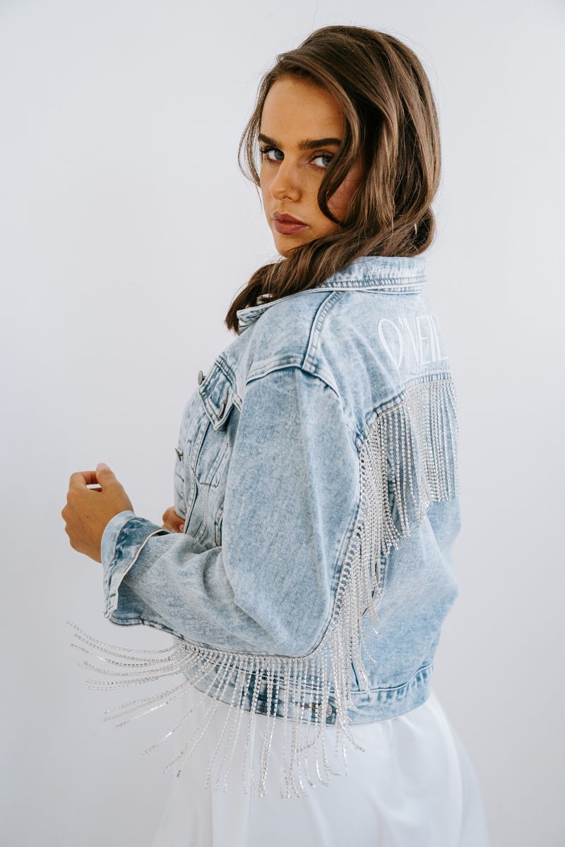 This customised denim jacket is for the bride who isn't afraid to make a statement. Luxurious chain detailing drapes across the back and down the arms, which moves beautifully making it ideal for those wedding day, or bridal shower photos. Personalise your denim jacket by adding your new surname (or text of your choice) across the back.