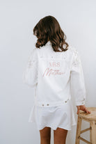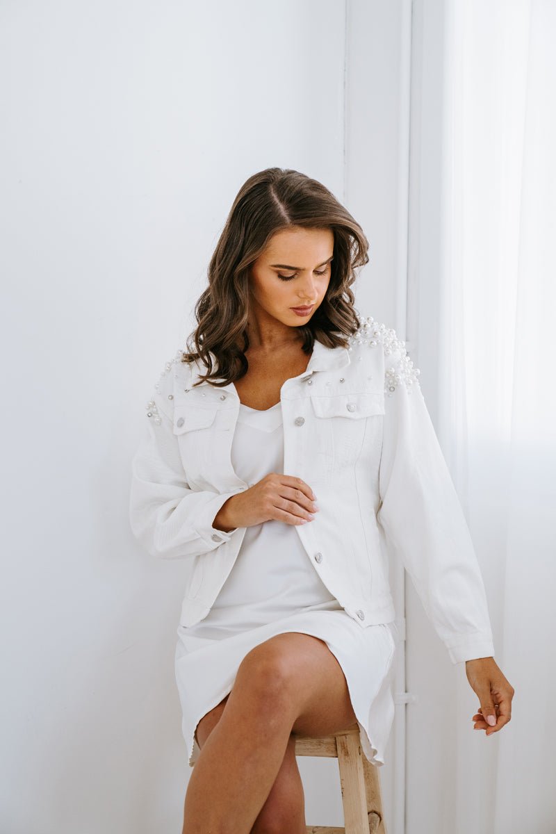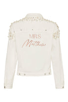 Our personalised pearl denim jacket are the perfect accessory for your wedding day. Featuring pearl and rhinestone encrusted shoulders, and finished with luxe embroidery in the colour of your choice.